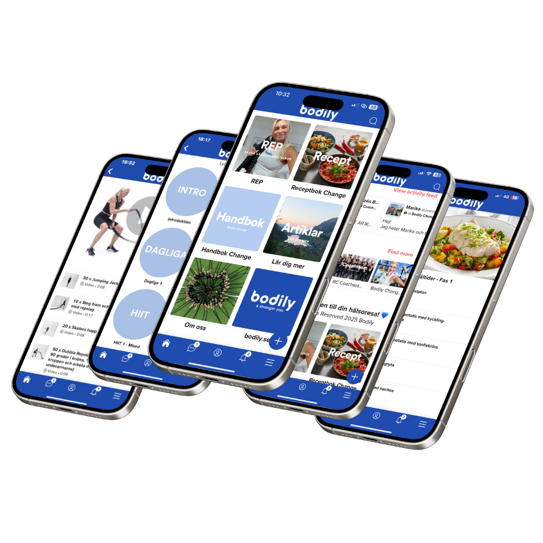 För dig som vill få struktur, tydlighet och stöd – så att träning och bra mat faktiskt blir av i vardagen. Här får du allt samlat i Bodilyappen: träning, recept, coachning och community.